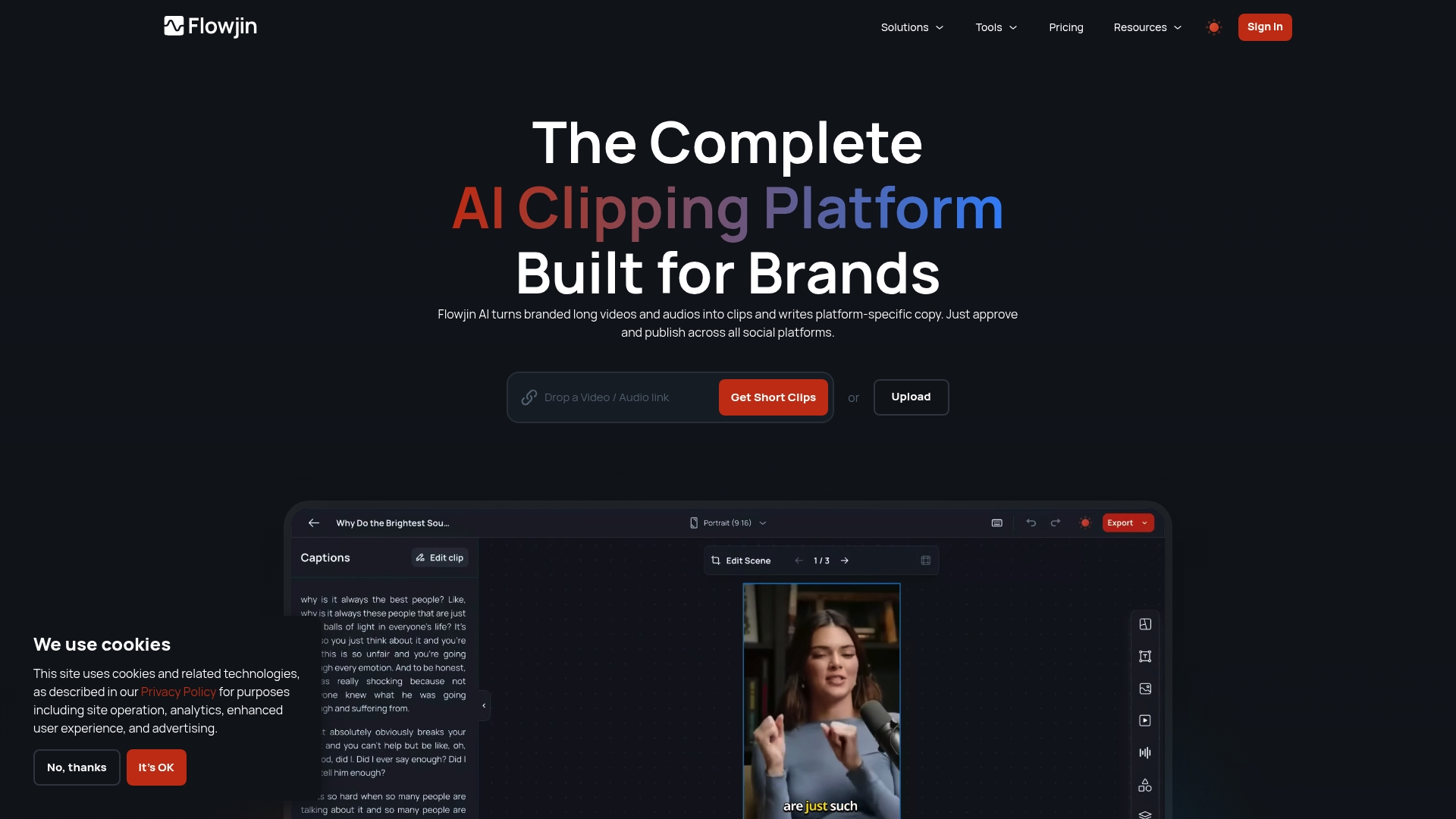 Flowjin converts long-form video and audio into AI-generated short clips, and it produces platform-specific captions, titles, hashtags, and CTAs for TikTok, Instagram, YouTube, LinkedIn, and Twitter. The platform also supports multiple aspect ratios and export qualities like 720p and 1080p.